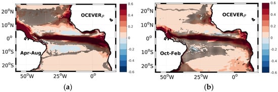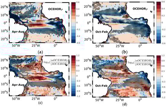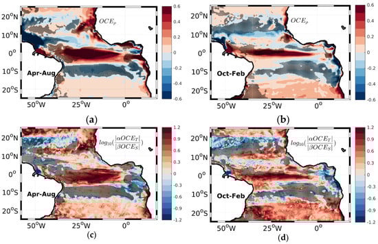 Figure 4 analyses the contribution of the oceanic processes to the mixed layer density (noted ). The general picture is very different from the emerging patterns of atmospheric fluxes. In this case, both seasons yield a similar, large-scale picture. Positive oceanic fluxes are found all year long in the central equatorial Atlantic and at the poleward edge of the subtropical gyres. Negative values are found around 10° to 15° north and south. The North Equatorial Counter Currant (NECC) seasonal retroflection is one of the clear seasonal features of this oceanic contribution. During the boreal summer, it leads to a reduction of density in the west of the basin and extending eastward around 10° N. This reduction is primarily due to the haline contribution (Figure 4c), which dominates by a factor greater than two. Around 10° S, within 15° N–20° N and along the north Brazilian coast, diminishes the mixed layer density with a maximum density along the Brazilian coast. Thermal and haline processes act together in these three regions (Figure 4: black dots). In these areas, thermal processes heat the upper water and, at the same time, oceanic haline processes freshen the mixed layer regions [,]. Their relative contributions on density are furthermore of similar magnitude. The strongest increase of density (>0.6 kg.m−3.month−1) occurs in the western equatorial band. Thermal and haline oceanic processes act both to increase the mixed layer density (Figure 4a,b: black dots) due to cooling and the accumulation of salt by the equatorial and coastal upwelling [,,]. In the equator, is the major contributor with a factor of more than 4 (Figure 4c,d shaded, ). Poleward of 15° S, density also increases all year long through oceanic processes, but the thermal and haline effect have opposite signs with a larger contribution of the former with a factor of two mainly during Oct–Feb (Figure 4d: shaded). In this area, oceanic haline processes freshen the mixed layer [] while thermal ones cool it []. Hence, the opposite effect occurs on oceanic buoyancy.
