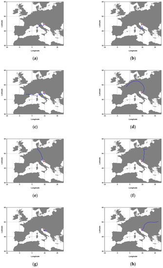 Air trajectories calculated for the Mali Lošinj observation site using METEX software and kinematic model. Calculations are carried on for the following days marked with letters: (a) 23 September 2004, (b) 22 October 2004, (c) 27 April 2005, (d) 25 May 2005, (e) 10 June 2005, (f) 15 July 2005, (g) 25 July 2005, (h) 19 August 2005, (i) 15 September 2005 and (j) 25 October 2005. Trajectories are calculated for 3 days backwards from the date mentioned above.