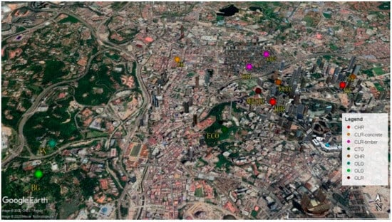 In order to correctly categorize the land-uses the built-up monitoring locations represent, the three-dimensional (3D) building data was used to calculate the average level of compactness and average building height within the 200 m around the sensor locations (Figure 1). The assessment regarding the level of compactness was done based on the λp parameter, which was calculated as the ratio of the planar area within the grid cell occupied by the buildings to the total grid area [23].