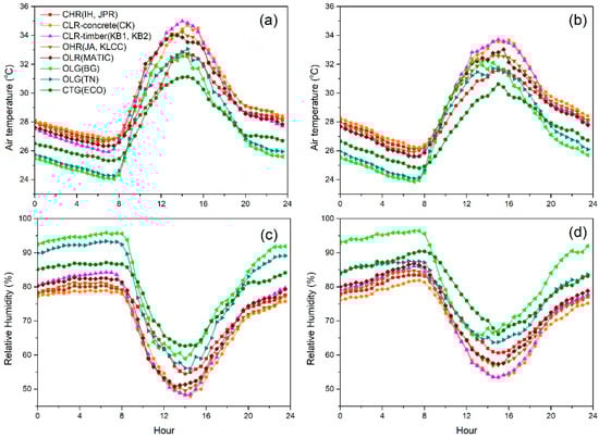 The diurnal near surface air T and RH variations in the monitoring locations are shown in Figure 4a–d for a month each in wet and dry seasons in 2018: from 20 February to 18 March, which correspond to the end of the rainy Northeast Monsoon, and from 9 June to 1 July, which is a part of the drier Southwest Monsoon, respectively [18,43]. The selection of these two different months also provides an opportunity to delve into the impact of solar angle on the thermal environment, as Kuala Lumpur is located near the equator the solar radiation is stronger in March, while the solar elevation angle is higher in June.