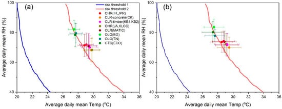 Measured average daily and average daily mean temperature (T) and relative humidity (RH) values in different land-use areas against the risk threshold derived by Mora et al. [45] in wet (a) and dry months (b).