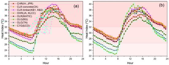 where T is air temperature (°C) and RH is the ambient relative humidity (%). The calculated average diurnal heat index variations for different land-use categories are shown in Figure 6. As can be seen, the heat index values are almost always higher than the measured air temperature values. According to the assessment scale of heat index, the index values between 27 °C and 32 °C would be category “caution,” where the possible heat disorders for people in high risk groups would include fatigue, possible with prolonged exposure and/or physical activity. The heat indexes between 32°C and 41 °C, on the other hand, would call for “extreme caution,” where sunstrokes, muscle cramps, and/or heat exhaustion possible with prolonged exposure and/or physical activity are among possible health risks [47]. As seen in Figure 6, an assessment based only on air temperatures would significantly underestimate heat experience in most of the land-use areas with the maximum temperatures lying on the 34–35 °C range as opposed to maximum heat indices at around 40 °C, which are out of the thermal comfort range by a margin dangerously beyond what is accepted as tolerable, i.e., ±1.1–1.7 °C [49], and fall almost entirely under caution and extreme caution categories. Importantly, the risk categorization used here might not be representative of people native to tropical areas. While there are no conclusive studies regarding how heat-induced health risks vary in the tropics, the natives of tropical areas are reported to have a higher tolerance to elevated temperature and humidity conditions [50,51,52,53,54].
