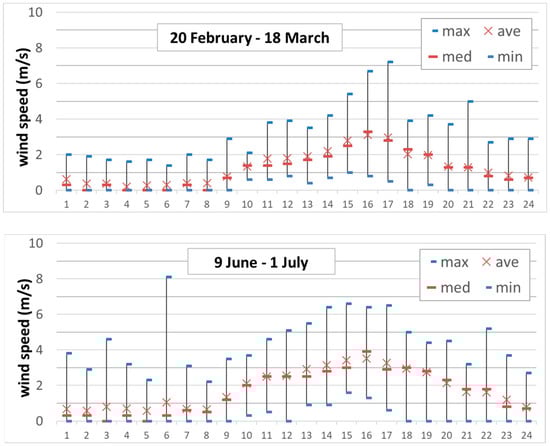 The diurnal wind speed ranges, averages and medians for Subang averaged over the wet and dry periods focused in this study (data from MetMalaysia).