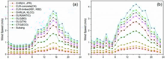 ADMS-Urban is a fast local-scale urban climate modelling tool, widely used to calculate the spatiotemporal variation of neighborhood or city scale urban temperatures and dispersion modelling. The parametrization and land-use input data used in the ADMS modelling of Kuala Lumpur to study the urban temperature perturbations was previously described in [58]. In addition to this, in this study a detailed urban canopy model with 200 m resolution was developed to quantify the roughness length in terms of building density and geometry [59] to model hourly wind speeds at 10 m height. The modelled diurnal wind speed trends for 20 February 2018 and 9 June 2018 are shown in Figure 8a,b, respectively. 20 February and 9 June are the first days of our selected wet and dry season windows, respectively, and it was assumed that the overall diurnal wind speed profiles obtained for these two days are representative for the rest of the selected months. The obtained trends clearly demonstrate the contrast of wind speed diurnally between the two green areas, BG and TN, and built up areas for both seasons, with slightly higher values in the dry season.