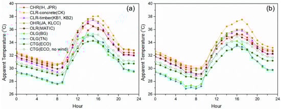 Diurnal variation of calculated apparent temperatures in wet (a) and dry (b) seasons for different land use areas.