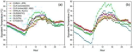 Diurnal variation of calculated equivalent temperature in wet (a) and dry (b) seasons for different land use areas.