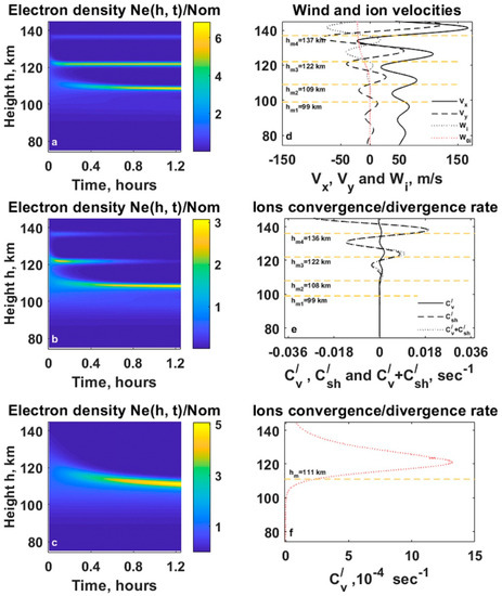 Figure 1 shows the formation of multilayered sporadic E, with sublayers at fixed heights, by the AGWs and background horizontal wind (panels a and b). The heavy metallic ion/electron content in the initial layer () is redistributed and in this case (, , , , , ), the four Es-type relative thin dense layers (panel a) are formed with , , , and . As it was predicted by the theoretical model in Section 2, these layers are localizing in the regions of ion vertical drift velocity nodes at , , , and (panel d). The ion total convergence rates () in the vicinity of these regions have maximal values , , , and , respectively (panel e). The comparison of the parameters corresponding to panels a and b show that the combined effect of the wind velocity magnitude, direction (with ), and shear (with ) on the ion total convergence rates (), leading to the significantly higher peak densities (, , , and ) of the formed Es layers (panel a), than only the windshear effect (), where , , , and (panel b).