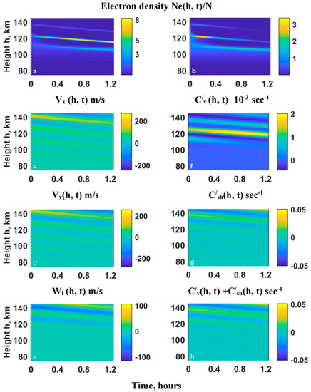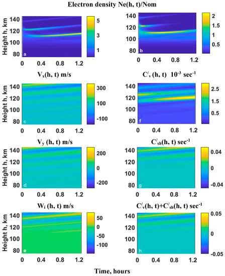 Figure 1a,b also show that ion ambipolar diffusion has a significant effect on the formed Es layers densities (Equations (11), (16), and (17)). In this case, at and , for the increase in densities caused by the AGWs after about t-to > 0.6 h is balanced by diffusive displacement (), and their densities have tendency of saturation (Figure 1a). In case of only windshear effect, the diffusion (with condition ) leads to a bigger decrease of the Es densities (Figure 1b).