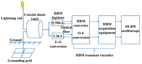 Since 2006, the Chinese Academy of Meteorological Sciences lightning research group has carried out triggered lightning experiments in Conghua District, Guangzhou City. More information about this experiment can be found in [17]. This paper analyzes the directly measured current data of 14 triggered lightning events in 2019, which were measured using a 1 mΩ coaxial shunt. As shown in Figure 1, the lower part of the coaxial shunt was connected to ground and the upper part was connected to a lightning rod. The current waveform was digitized by an HBM digitizer and transmitted via optical fiber to an HBM transient recorder in the control room. Then, the converted signal by O-E (optical-electro) conversion was output to a DL850 oscilloscope for recording. In order to realize the complete recording of the large current signal and weak current signal at the same time, we set up two HBM digitizers with ranges of ±50 and ±2 kA, respectively. At that point, the minimum current resolution was about 5 A. In addition, the ground-level quasi-static electric field was detected by a CS110 electric meter that was installed 85 m away from the lightning rod. The positive electric field indicated negative charge overhead.