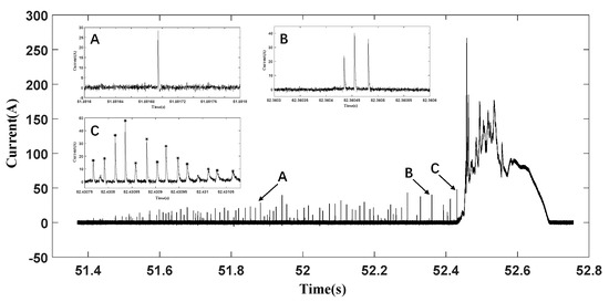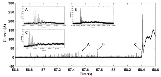 Not every self-sustaining development is continuous and stable. Some self-sustaining developments are short-lived. After a short self-sustaining development ends, a new initial process may start with the rise of the rocket. Therefore, there may be multiple initial processes in an initial stage. Each initial process is similar to the description in Section 1. Taking the triggered lightning 570 as an example, the rocket was launched when the ground-level quasi-static electric field was 1630 V/m, which is significantly smaller than that of triggered lightning 370. The current waveform and partially enlarged view are shown in Figure 4. It can be seen that the initial stage included three initial processes, lasting 1634.35 ms, which is longer than that of triggered lightning 370. The first initial process lasted 786.94 ms and ends at position A in Figure 4. A represents the IPCPs at the beginning of the first self-sustaining development. The ICC process after the first IPCPs lasted 0.335 ms. Subsequently, there was a current quiet period of 59.08 ms after the ICC disappeared. The second initial process ends at position B in Figure 4, which represents the IPCPs at the beginning of the second self-sustaining development. The ICC process after this IPCPs lasted 2.757 ms. Subsequently, there was a current quiet period of 129.13 ms after the ICC disappeared. The third initial process continues to the position C in Figure 4, which represents the IPCPs at the beginning of the third self-sustaining development. Subsequently, the duration of ICC process was 378.364 ms. Since this paper mainly studies the initial stage of triggered lightning, only part of the current waveform of the third ICC process is shown in Figure 4.