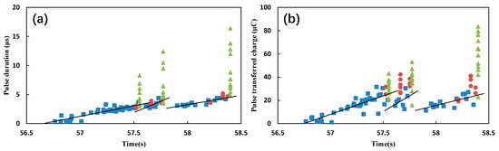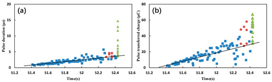 (3) In each initial process, when the pulse duration and transferred charge of a PCP gradually increase to a certain extent, PCP clusters and IPCPs will appear. According to the research results, when a PCP cluster appears, the average value of the pulse durations and transferred charges of PCPs are 3.48 μs and 19.53 μC, respectively. When IPCPs appears, the corresponding average values are 4.69 μs and 27.23 μC, respectively.