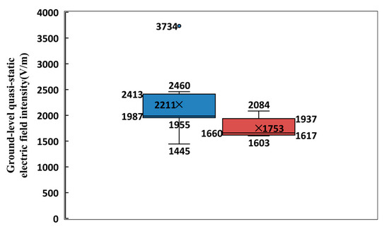 Figure 6 is a statistical diagram of the ground-level quasi-static electric field corresponding to two forms of triggered lightning when the rockets were launched. It can be seen that the electric field strength corresponding to the single initial process form was larger. After removing an apparently large value of 3734 V/m, the quasi-static electric field strength was between 1445 and 2460 V/m during the rocket’s launch, with an upper quartile of 2413 V/m, a median of 1987 V/m, a lower quartile of 1955 V/m and an average of 2211 V/m. In contrast, the quasi-static electric field strength for the multiple initial process form was between 1603 and 2084 V/m during the rocket’s launch, with an upper quartile of 1937 V/m, a median of 1660 V/m, a lower quartile of 1617 V/m and an average of 1753 V/m.
