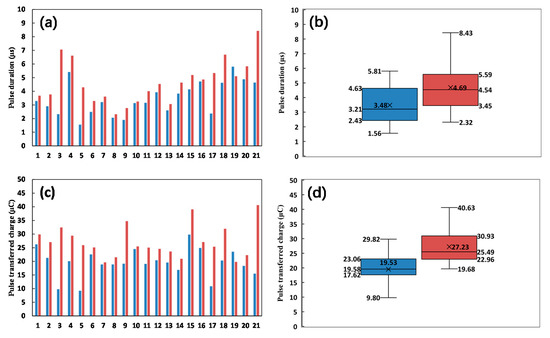 Pulse durations and transferred charges of PCPs when PCP clusters and IPCPs appear. (a) Pulse durations during each case. (b) Pulse durations for all cases. (c) Pulse transferred charges during each case. (d) Pulse transferred charges for all cases. The blue is PCP clusters, and the red is IPCPs.
