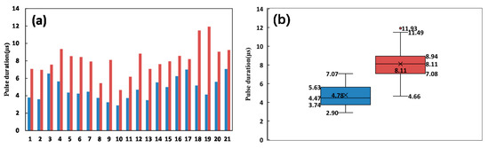 Figure 10 shows the average pulse durations of IPCPs and their closest PCP clusters. The average pulse durations of the IPCPs were greater than those of their closest PCP clusters during each initial process (see Figure 10a). The overall statistics in Figure 10b also show a similar result. The average pulse durations of IPCPs were in the range of 4.66–11.93 μs, with an average and median of 8.11 μs for both. In contrast, the average pulse durations of PCP clusters were in the range of 2.9–7.07 μs, with an average of 4.78 μs and a median of 4.47 μs. In this paper, the pulses with smaller amplitudes are also included in IPCPs, resulting in slightly larger durations than other reports. For example, Jiang et al. [7] showed that the average pulse duration of an IPCPs was 3.2 μs in Shandong. Zhang et al. [16] found that the average pulse duration of an IPCPs was 3.5 μs in Guangzhou.
