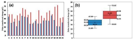 Figure 11 is a statistical diagram of the average pulse transferred charges of IPCPs and their closest PCP clusters. The average pulse transferred charge of an IPCPs was greater than that of its closest PCP cluster during each initial process (see Figure 11a). The overall statistics in Figure 11b also show a similar result. The average pulse transferred charges of IPCPs were in the range of 30.83–72.62 μC, with average values of 51.81 μC and a median of 50.83 μC. In contrast, the average pulse transferred charges of PCP cluster ranged from 21.89 to 47.99 μC, with average values of 34.31 μC and a median of 35.2 μC. These results are basically consistent with the other reports. For example, the average pulse transferred charges of an IPCPs were 54.8 and 46 μC in Shandong [7] and Guangzhou [16], respectively.