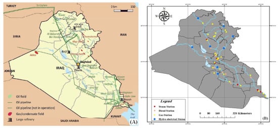 (A) Iraq hydrocarbon resources and infrastructure; (B) types of electrical energy production stations in Iraq (steam, diesel, gas, and hydro-electrical stations).