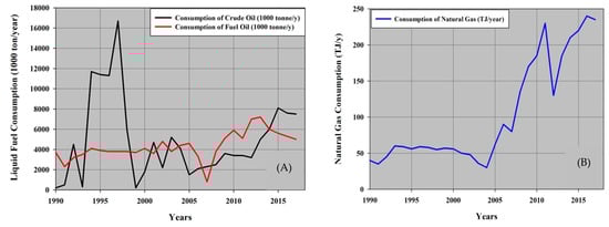 One of the main obstacles to Iraq’s economic and social development is a severe shortage of electricity. Despite the significant increase in power grid capacity in recent years, it is still far from sufficient to meet the growing demand. Building additional generation capacity and ensuring that it has sufficient fuel supplies is an immediate priority of Iraq’s electricity sector [3]. The absence of a reliable national electrical power network has led to the spread of different kinds of generators of various sizes servicing homes, farms, factories, and various governmental and non-governmental institutions. Owners of large generators of residential and industrial areas use fuel oil mixed with gas oil because it is cheap and due to a lack of kerosene. This leads to increased GHG emissions and other air pollutants to the atmosphere [20]. The continued operation of these private generators represents high generating costs, and leads to environmental pollution and the emission of large amounts of carbon. Estimates indicate that the total cost incurred by the Iraqi economy due to lack of electric power annually exceeds United States Dollar USD 40 billion [21]. There are various types of power plants in Iraq; in 2016, there were eight steam plants utilizing liquid fuels, such as crude oil, fuel oil, and gas oil, 33 gas stations, and 12 diesel stations [22]. Gas stations have many favorable characteristics with respect to Iraq’s immediate needs, including relatively short build times and low capital requirements, which allow a large amount of generating capacity to be added quickly [3]. Iraq has imported gas from Iran to run its power plants, although Iraq is ranked fourth globally in the burning of associated gas; in 2016, Iraq produced 29.32 million cubic meters of gas, while the amount of burned gas amounted to 17.71 million cubic meters, accounting for 60.4% of total production [23]. Figure 2 represents Iraq’s consumption of crude oil and fuel oil in units of thousand tons/year, and consumption of natural gas measured in terajoules per year (TJ/year), for electricity generation for the period 1990–2017.