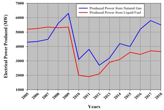 Figure 3 shows the electrical power produced in megawatts (MW) using liquid fuel and gas in Iraq’s power plants from 2005 to 2018. The figure shows that liquid fuel dominated the generation of electricity in Iraq until 2009, before falling sharply and reaching its lowest level in 2010 of 1966 MW, and then rising gradually to 3750 MW in 2017. On the other hand, starting in 2007, the generation of electricity from gas rose to the 2009 peak of 6348 MW and then fell sharply in 2010 to 3073 MW. Since 2010, electricity generation from gas has climbed, albeit unsteadily, to 5842 MW in 2017.