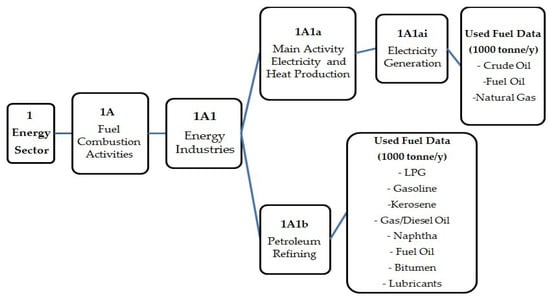 The methodology used for GHG emission inventories was created by the Task Force on Greenhouse Gas Inventory (TFI) within the IPCC. The originally used methodology was published in 1996 [27]. Subsequently, updated IPCC 2006 Guidelines were developed [28]. This latest and currently valid methodology contains detailed procedures for estimating emissions and sinks of GHGs for all sectors. Emissions and sinks of GHGs emissions are determined by origin from specific sectors: Energy, Industrial Processes, and Product Use, Agriculture, Land Use, Land Use Change, Forestry, and Waste [28,29]. The energy sector in Iraq plays a major role in GHG emissions. It usually accounts for about 75% of total GHG emissions in CO2 equivalent terms [10]. In the current study, emissions of CO2, CH4, and N2O were estimated according to the IPCC methodology from stationary combustion in the category of Energy Sector (1), Fuel Combustion Activities (1A), Energy Industries (1A1). Subcategory (1A1) was then further divided into Main Activity Electricity and Heat Production (1A1a) and Petroleum Refining (1A1b). The IPCC Inventory Software (Version 2.54) for estimating CO2, CH4, and N2O emissions from Electricity Generation (1A1ai) and Petroleum Refining (1A1b) categories uses consumption fuel data (in 1000 tonne/year) as the inputs to estimate CO2, CH4, and N2O emissions. Figure 4 shows the flowchart of the main categories in the energy sector and the fuel data used to estimate CO2, CH4, and N2O emissions in this study, according to the IPCC methodology.