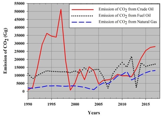 The results of CO2 emissions from the consumption of crude oil, fuel oil, and natural gas in electricity generation from 1990 to 2017 are shown in Figure 5. As shown, the highest emissions of CO2 from crude oil was recorded in 1997 at 51,000 Gg, while the lowest level of emissions from crude oil consumption occurred in 1999. During the period 2002–2005, CO2 emissions from crude oil were subject to significant fluctuations, due to the fluctuation of oil production. Beginning in 2006, the emission of CO2 gradually increased from crude oil, due to the consumption of large quantities of crude to generate electricity, which reached 28,000 Gg in 2017. CO2 emissions increased due to the gradual increase in the consumption of fuel oil for electricity generation from 1991, and reached a decade-high in 2002 of 14,000 Gg; emissions then fell to their lowest level in 2007, of 2000 Gg, due to the security conditions at the time, which affected the generation of electricity. During 2008–2016, the emission of CO2 from fuel oil was subject to significant changes, due to fluctuations in refinery production; emissions peaked in 2012 at 21,000 Gg, and then fell sharply in 2013 to more than 2800 Gg. Of the three fuel sources used to generate electricity in Iraq shown in Figure 5, the lowest CO2 emissions were recorded from the consumption of natural gas. The CO2 emissions from natural gas were relatively stable during 1990–2002, before falling to their lowest level in 2004, of 1070 Gg, due to the decrease in production, which affected the generation of electricity and reduced processing hours. After 2005, CO2 emissions gradually increased to reach their highest level in 2011 of approximately 12,000 Gg. In 2012, emissions fell to around 7100 Gg, before rising again to reach a high of 13,000 Gg in 2017. The fluctuation of CO2 emissions from the consumption of crude oil, fuel oil, and natural gas in electricity generation is due to the varying quantities consumed in the widespread electricity generation using crude and fuel oil, particularly in thermal stations scattered on the banks of the Tigris and Euphrates Rivers in Iraq. The total of CO2 emissions from the types of used fuel (crude oil, fuel oil, and natural gas) in electrical generation of Iraq was approximately 14,000 Gg and 58,000 Gg in 1990 and 2017, respectively. The increase of CO2 emission was greater than 316% between 1990 and 2017.