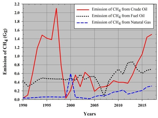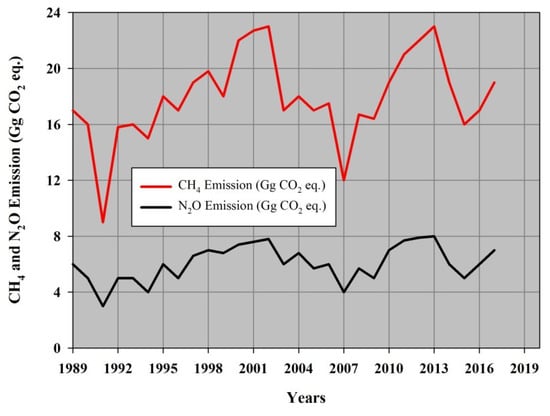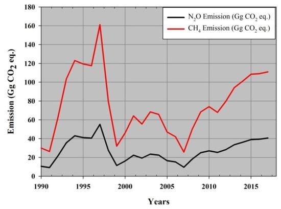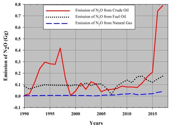 The results of N2O emissions from the consumption of crude oil, fuel oil, and natural gas in electricity generation from 1990–2017, as shown in Figure 7, indicate that the highest level of N2O emissions from crude oil in 1990–1999 was 0.1 Gg in 1997, before falling to their lowest level in 1999. Crude oil production during 2000–2005 was subject to fluctuations that caused N2O emissions to fall to 0.04 Gg in 2005. Emissions then increased continuously from 2006 to reach 0.8 Gg in 2017. N2O emissions from fuel oil consumption were relatively stable during the period 1991–2005, due to the stability of fuel oil production in refineries, and fuel oil’s use in electricity generation and other industrial purposes; the highest emission of 0.12 Gg was reached in 2002. The lowest N2O emission from the consumption of fuel oil, of 0.02 Gg, was recorded in 2007, before a period of fluctuation from 2008 to 2015. The highest N2O emission from fuel oil was 0.2 Gg in 2017. From Figure 7, the emissions of N2O from the consumption of natural gas to generate electricity were at low values, due to the emission of small quantities of N2O compared to the gases CO2 and CH4. The highest N2O emission from natural gas consumption was 0.04 Gg in 2017. The total of N2O emission from electrical generation was 0.01 Gg and 1.001 Gg in 1990 and 2017, respectively. The increase of N2O emission between 1990 and 2017 was very wide, based on Figure 7.