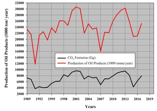The study results show that emissions of CO2, CH4, and N2O from the oil refining industry in Iraq during 1989–2017 were subject to sharp declines in the years 1991, 2003, and 2007, due to the decrease in the production of oil derivatives of refineries because of political and security conditions. The emissions of these gases depend mainly on the production of oil derivatives from the refineries according to a direct relationship. Figure 9 shows the production of oil derivatives, in terms of Gg/year, and CO2 emissions from oil refining in Iraq. The lowest value of CO2 emissions reached was 3700 Gg in 1991, due to the first Gulf War. Then, the CO2 value increased dramatically in 1992 to reach 6600 Gg. After a fluctuating rise throughout the 1990s, the highest value of CO2 emission was 9600 Gg in 2002. In 2003, due to the second Gulf War, CO2 emissions decreased to 6900 Gg, before decreasing to 4900 Gg in 2007 due to security conditions at the time and the resulting stoppage of most refineries. From 2008, the CO2 emissions increased in a stable fashion, reaching 9500 Gg in 2013, the highest level since 2002, before decreasing to 8200 Gg in 2014 due to the discontinuation of the existing refineries in Salahuddin, Mosul, and Anbar provinces because of the ISIS terrorist occupation of these regions. In 2017, the production of oil derivatives from the refineries increased again, causing CO2 emissions to peak at reached 8000 Gg. The total of CO2 emissions in oil refining of Iraq was approximately 7300 Gg and 8000 Gg in 1989 and 2017, respectively. The increase of CO2 emission reached 8.8% between 1989 and 2017.