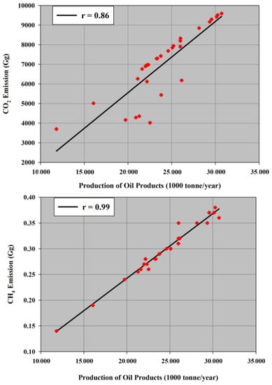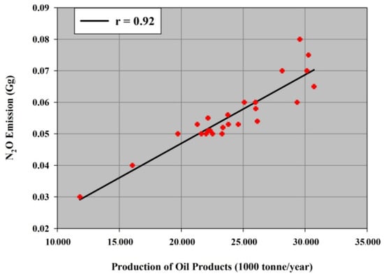 The results of the correlation coefficient showed a strong and positive relationship between the emissions of CO2, CH4, and N2O and the production of oil derivatives from the oil refining industry in Iraq; correlation coefficients amounted to 0.86, 0.99, and 0.92, respectively, as shown in Figure 12. The production of oil derivatives increased in refineries, resulting in greater emissions of the three GHGs. Of note, the correlation between CO2 and the production of petroleum derivatives was higher than the other gases because CO2 accounts for the largest share of GHG emissions, followed by CH4 and N2O from the refining industry.
