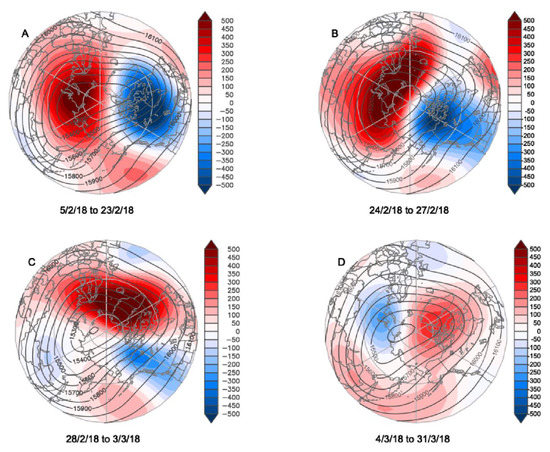 Based on the National Centers for Environmental Prediction-National Center for Atmospheric Research (NCEP–NCAR) reanalysis [10], Figure 1 tracks the geopotential height field at 100 hPa for February–March 2018; each sub-figure captures a period of relative stationarity. SPV anomalies in the lower stratosphere are known to have strongest coupling to the surface weather (e.g., [11]); hence we use a 100 hPa geopotential height field to illustrate the evolution of the vortex. A weakening of the SPV occurred through most of February and March, with a sudden stratospheric warming (SSW) [12,13,14,15] onset in mid-February. The SPV, after being centered near the North Pole for January, 2018 (not shown), was split with a stronger center persistent over northeastern Canada for most of February (Figure 1A), and a secondary center over Siberia. This North American vortex then migrated westward. A SPV was located over the northern coast of Siberia for much of March (Figure 1D).