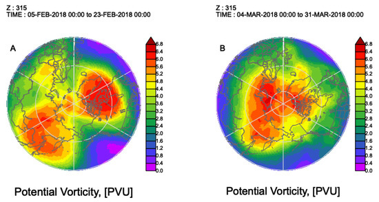 Potential vorticity (PV) at 315 K isentropic surface during (A) 5–23 February and (B) 4–31 March, 2018. The unit is PVU (1.0 PVU = 10−6 K kg−1 m2 s−2). In climatology, the 315 K isentropic surface extends from the lower stratosphere in the Arctic region to the mid-troposphere in the sub-Arctic or midlatitudes.