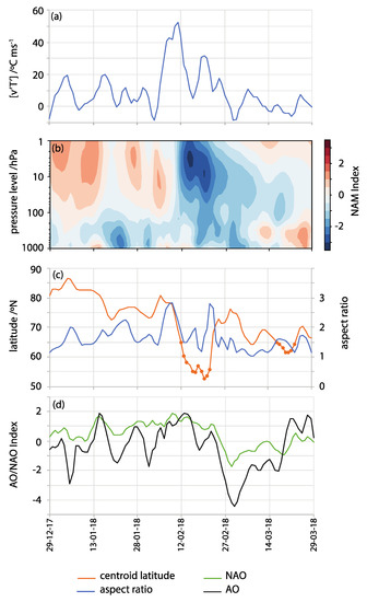 Figure 3 shows features of the SPV, SSW, and atmospheric circulation indices at lower levels for winter 2017–2018. The large increase in the meridional eddy heat flux at 100 hPa from early to mid-February represents the upward influence of the troposphere (Figure 3A), indicating an upward propagation of planetary waves that reinforced the late February SSW event. The Northern Annular Mode (NAM) Index, calculated as the inverse of the polar cap geopotential height anomaly averaged over 65–90° N at different atmospheric levels, demonstrates the downward propagation of the negative NAM anomalies (Figure 3B) following the pronounced increase in upward wave activity flux shown in Figure 3A. This suggests an SSW contribution to the tropospheric anomalies during the second half of February [14,19]. We use NAM for calculating at all atmospheric levels while the Arctic Oscillation (AO) is reserved for the 1000 hPa level. While there is a brief period of vortex splitting prior to 12 February according to the moments method, this SSW is identified primarily as a displacement event. There is a 10-day period when the vortex is displaced southward of 66° N (Figure 3C), starting before 12 February-the date of the SSW onset. This date is also identified as SSW onset by a wind reversal diagnosis [12,20]. As the vortex moves poleward again, there is a second brief elongation of the vortex (increased aspect ratio). Following, as the vortex starts to move equatorward, there is a lagged response in the AO and North Atlantic Oscillation (NAO) surface indices (Figure 3D), and these indices continue to become more negative after the vortex displacement has recovered, reaching minima around 18 days after the onset of the SSW in the stratosphere.
