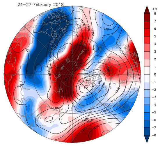 Composite of atmospheric 850 hPa geopotential height (contours in units of m) and temperature anomaly fields (color shading) for 24–27 February 2018. Data are from NCEP–NCAR reanalysis.