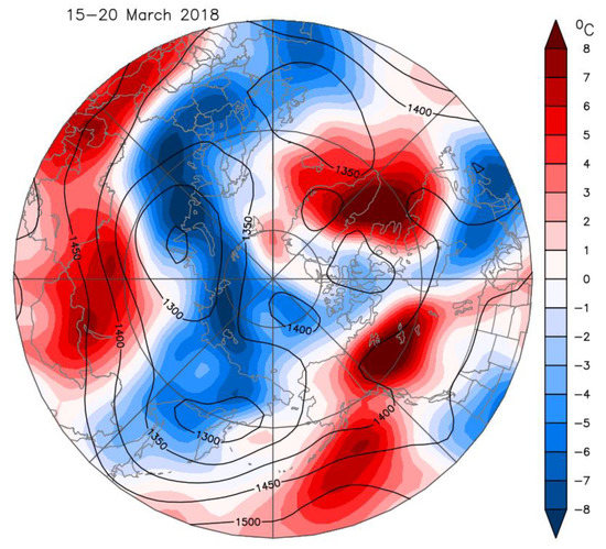Composite of atmospheric 850 hPa geopotential height (contours, in units of m) and temperature anomaly fields (color shading) for 15–20 March 2018. Data are from NCEP–NCAR reanalysis.
