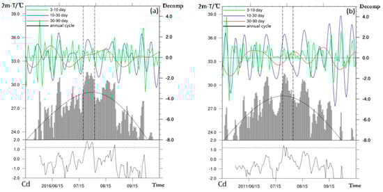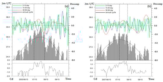 Temporal evolutions of area-mean (25° N–30° N, 113° E–118° E) daily 2 m air temperature (2 m-T) (°C, gray bars) and associated decompositions (Decomp): the climatological annual cycle across 2000–2017, 3-to-10-day synoptic disturbances, 10-to-30-day and 30-to-90-day intra-seasonal variability (the four solid lines in the top panel) along with (bottom panel) the daily compound indices (Cd) for two typical EHW events persisting more than 15 days, respectively, in (a) 2003 and (b) 2007 (Table 1). The time periods of two EHW events are highlighted within two vertical dashed lines in the two top panels of (a,b).
