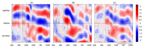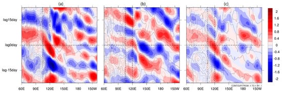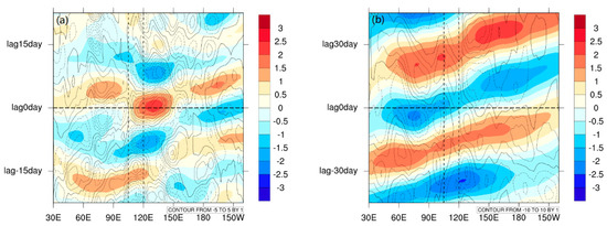In the above analyses, we revealed that westward (northward)-propagating ISV from the western Pacific (equatorial region) plays a dominant (supportive) role in the occurrences of EHW events in SC. To what degree are these ISV signals connected with the eastward-propagating tropical planetary-scale Madden–Julian Oscillation [37]? Figure 7a,b shows the along-equatorial composite hovmoller diagrams of OLR and (200 hPa–850 hPa) velocity potential anomalies in association, respectively, with 10–30-day and 30–90-day ISVs averaged between 30° S and 30° N. On the 10–30-day time scale (Figure 7a), the onset period of the composite EHW events corresponds to the positive anomalies of OLR and (200 hPa–850 hPa) velocity potential. The action centers shift to the east of the SC, suggesting a strong connection with the western Pacific subtropical high. The strong subsidence in association with positive OLR and velocity potential anomalies favors clear sky and the formation of an extended heat-wave in SC. It is worth pointing out that the positive 10–30-day ISV signals affecting the SC in Figure 7a are mostly stationary, not resulting from any eastward-propagating precursor on this time scale. This may be connected with the suppressed phase of the 30–90-day MJO before the onset (Figure 7b) through the emanating westward (Figure 3)- and northward (Figure 5)-propagating intraseasonal disturbances [35,38].