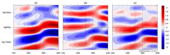 It was found that, during the onsets of short-term (Figure 3a), long-term (Figure 3b), and all EHW (Figure 3c) events, the composite positive surface air temperature anomalies in SC coincide with the positive 500 hPa geopotential height anomalies on the 10–30-day time scale. The positive anomaly of short-term events is the strongest (Figure 3a), and the duration of short-term events is basically controlled by the positive anomaly of 500 hPa geopotential height associated with the 10–30-day ISV. It is worth mentioning that for long-term events, 15 days after the onsets of the events, another positive anomaly of geopotential height reemerges in the study region, which helps maintain the long-term EHW events. For both the short-term and long-term composites (Figure 3a,b), particularly the all-case composite (Figure 3c), the positive 500 hPa geopotential height anomalies can be traced back into the western Pacific. In the composition of all events (Figure 3c), the signal of positive anomaly of 500 hPa geopotential height exists more than 15 days before the event onset. The positive anomaly at about 150° W propagates westward all the way to the study area on the EHW onset day. Apparently, westward-propagating 10–30-days ISV from the western Pacific is a potential precursory signal for the EHW events in SC with a lead time of one-to-two weeks [5,6].