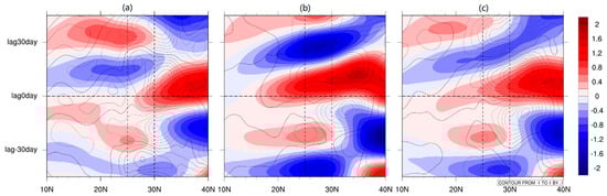 The 500 hPa geopotential height anomalies of 30–90-day ISV have little effect on short-term EHW events (Figure 4a). However, for long-term EHW events, the 500 hPa geopotential height anomaly of 30–90-day affects the whole period (Figure 4b). The duration of the long-term EHW event is basically overlapped with the 500 hPa geopotential height positive anomalies of 30–90-day ISV. Averaging all the EHW events together, the positive anomaly of surface air temperature within the study area is also co-located with the positive anomaly of 500 hPa geopotential height (Figure 4c). Similar to the 10–30-day ISV, the westward-propagating 30–90-day ISV is also a potential precursory signal of the EHW events in SC with a lead time of about one month. In particular, the 30–90-day ISV has a strong effect on the persistence of long-term events [6].