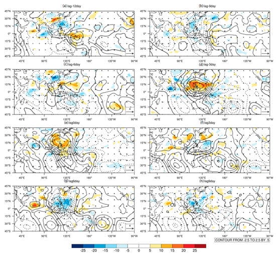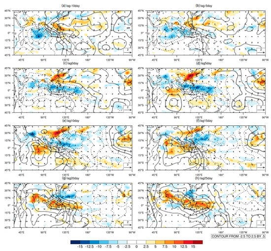 Same as Figure 8, but for 30-to-90-day intra-seasonal variability on lag days of −10 (a), −5 (b), 0 (c), 5 (d), 10 (e), 15 (f), 20 (g), 25 (h) of all EHW events.