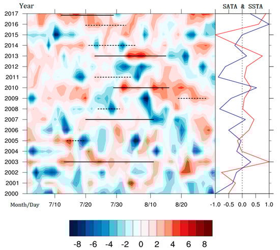Temporal evolutions (left part) of domain-averaged (25° N–30° N, 115° E–125° E) daily 500 hPa geopotential height anomalies in two peak summer months (July and August) from 2000 to 2017 (shading, dagpm); the horizontal black solid (dashed) lines, respectively, highlight 11 EHW events persisting longer (shorter) than 15 days. The two zig-zag lines on the right side are, respectively, standardized domain-mean (25° N–30° N, 115° E–125° E) surface air temperature anomalies (SATA) averaged through July and August (in red color) and the associated index of the sea surface temperature anomaly (SSTA) (in blue color, the detail definition of this SSTA index can be found in the context).