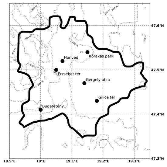 Hungary’s capital, Budapest, the ninth largest city of the European Union, has been facing high concentrations of particulate matter (PM), and the guidelines defined by the European Environmental Agency have been exceeded at urban monitoring sites, especially in the winter []. The World Health Organization estimated an approximate 8000 deaths related to outdoor air pollution in Hungary each year [] and the APHEKOM (Improving Knowledge and Communication for Decision Making on Air Pollution and Health in Europe) project found that excess pollution caused by particulate matter smaller than 2.5 µm diameter (PM2.5) reduced life expectancy by 19 months in Budapest in the period of 2004–2006, which was the second highest value among the 25 investigated European cities []. The dominant local source of PM in the Budapest area is domestic heating [,,], but the contribution from large-scale transport is also considerable [,]. Winter stagnation episodes with persistent inversions and high PM2.5 concentrations pose a major environmental risk in Budapest [,] and are expected to amplify the seasonal flu epidemic []. Urban air quality regulation and decision-making policies rely on the monitoring sites operated by the Hungarian Air Quality Network. The dense urban monitoring network consists of 12 stations, 6 of which provide hourly PM2.5 measurements. The monitoring of data enables a good assessment of the present situation and long-term statistical evaluation of urban air pollution. However, the increasing need for flexible real-time decision making, as well as public awareness and active communication, raised an urgent need for near-real-time air quality predictions for urban locations. Besides local efforts to implement atmospheric chemistry transport models [,,], the need for air quality predictions and policy support in European countries lead to the development of several continental-scale atmospheric chemistry transport models [,] that provide operational air quality predictions for Budapest.