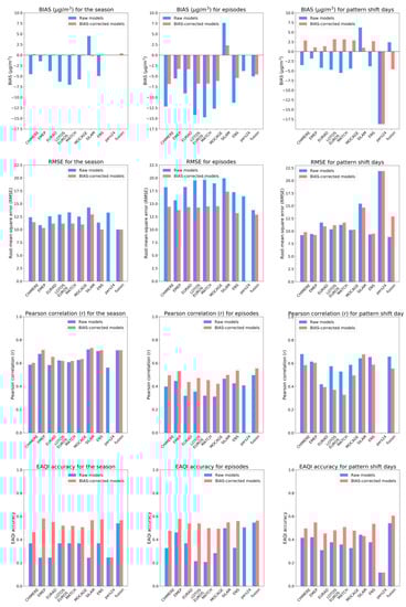 - Borrego, C.; Monteiro, A.; Pay, M.T.; Ribeiro, I.; Miranda, A.I.; Basart, S.; Baldasano, J.M. How bias-correction can improve air quality forecasts over Portugal. Atmos. Environ. 2011, 45, 6629–6641. [Google Scholar] [CrossRef]