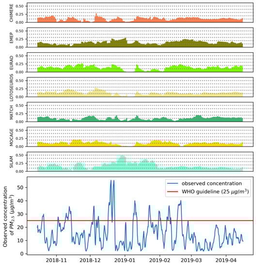 European operational air quality modeling efforts have been coordinated by the Copernicus Atmosphere Monitoring Service (CAMS [,]). In the winter of 2018–2019, the operational CAMS model ensemble consisted of seven individual models: CHIMERE [], EMEP [], EURAD-IM [], LOTOS-EUROS [], MATCH [], MOCAGE [] and SILAM []. The European air quality forecast for a typical operational and public use was the CAMS ensemble, defined as the median of the available model results at each grid-point []. CAMS models shared the ECMWF IFS (European Centre for Medium-Range Weather Forecast Integrated Forecasting System) meteorological driver and the TNO-MACC (Netherlands Organization for Applied Scientific Research - Monitoring Atmospheric Composition and Climate) emission inventory [,], and outputs were provided on the same grid with a horizontal resolution of 0.1°. However, the models were different regarding their native grid resolution, meteorology–chemistry coupling, physical and chemical parameterizations, the number of chemical species, and data assimilation [,,]. Therefore, the ensemble spread was often large, and the CAMS ensemble median was suggested to provide a robust estimate even in cases of divergent model results.