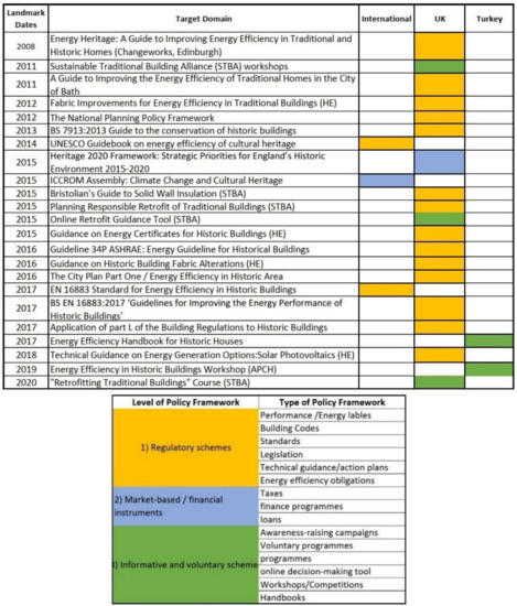 71] to improve energy efficiency in historic homes was published as the result of a project titled, “Energy Heritage” carried out in Edinburgh. It has become quite clear that in the UK since 2008 until the present, several studies, projects, workshops, technical reports and guidance plans, encompassing all the three levels of policy frameworks were published (
