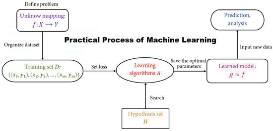 Machine learning is a series of computer programs, and its core task is to build mathematical models using statistics to make inferences from samples. Given a model that defines certain parameters, learning is the execution of a computer program that uses training data or experiences to optimize the parameters of the model. The model can predict the future state, or describe the knowledge from the data, or both. The practical process of machine learning methods (see Figure 1) can be summarized as follows: (1) Define a problem to an unknown mapping f and set a hypothetical set H of the solving model. (2) Collect and organize a training set D with a finite set. (3) Specify the loss function for the model. (4) Select the learning algorithm A. (5) Obtain the parameters that make the loss function fetch the pole hour and choose them as the optimal parameters of the model. (6) Save this model g with the optimal parameters, and use it to make predictions and analysis of new data.