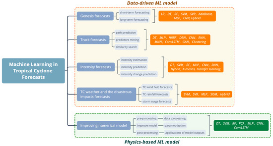 An organization chart of cases involving machine learning in tropical cyclone forecasts. The abbreviations used in this figure are as follows: logistic regression (LR), decision tree (DT), random forest (RF), support vector machine (SVM), support vector regression (SVR), multi-layer perceptron (MLP), convolutional neural network (CNN), generative adversarial network (GAN), recurrent neural network (RNN), hybrid radial basis function network (HRBF), self-organizing map (SOM), principal component analysis (PCA), convolutional long short-term memory network (ConvLSTM).