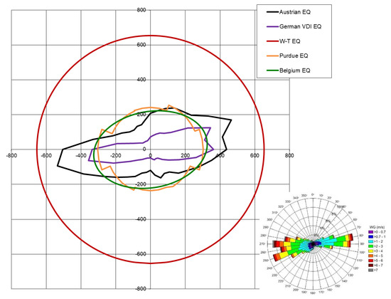 Separation distances calculated using the German VDI [5,14], Austrian [15], Belgian [16], Purdue [19] and Williams and Thompson (W-T) [21] empirical equations (EQs) for a protection level of rural areas and a 3000 head fattening pig livestock building. The wind statistics (frequency of wind directions and wind velocity per 10° sectors) from a site in Wels, Austria, are shown separately.