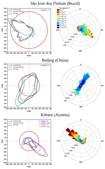 The third case study is from Kittsee (Austria). This site features separation distance results from two dispersion models, LASAT and AODM, using the p2m approach, in comparison to the two investigated EQs. While the parameters of the German VDI EQ have been derived using the German regulatory dispersion model AUSTAL2000, the parameters of the Austrian EQ have been derived from AODM calculations. Results applying f4 from [12] are also shown. The first couple (LASAT + f4 and the German VDI EQ) shows a good agreement for the largest separation distances, especially for the NW winds. These large separation distances in the far-field are a well-known effect due to the use of f4. This overestimation for separation distances of several hundred meters was discussed in detail in a previous study [25]. The second couple (AODM + p2m and the Austrian EQ) shows in general a good agreement for the calculated separation distances as well. For the secondary prevailing wind direction from ENE, thus with a transport direction towards WSW, the agreement between the separation distances of the two EQs is much closer. The inconsistency for the NW winds (transport direction towards SE) could be explained by the uncertainty intrinsically related to the estimation of instantaneous ambient concentrations by the p2m approach. For Kittsee, the wind velocity is distinctly higher as compared to the Beijing site. This could be a reason for the higher deviation between the dispersion models and the two EQs in Kittsee.