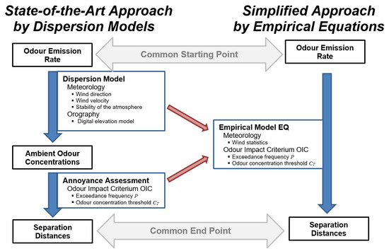 Figure 3 shows a schematic diagram comparing the state-of-the-art procedure to calculate separation distances using a dispersion model against the structure of EQs. It is acknowledged that dispersion models can simulate many more physical processes than EQs and thus often have to be run with more complex input data and parameterisations. In the simplified schematic shown here, both procedures start with the odour emission rate S and end with the direction-dependent separation distance E. The red arrows show the simplifications of the input parameters (meteorology and OIC) in the EQs.