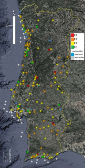 Geographical distribution and intensity of 184 reported tornadoes in mainland Portugal and over the sea near the coast (until 1 January 2020).