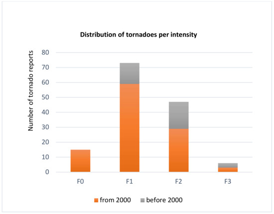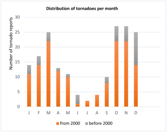 Distribution of tornadoes per month, considering 179 reports, can be seen in Figure 4. Summer events are unusual, with only 10 events being reported for June, July, and August. The larger number of tornadoes in December before the year 2000 is associated to the 4 reported events on 13 December 1864.
