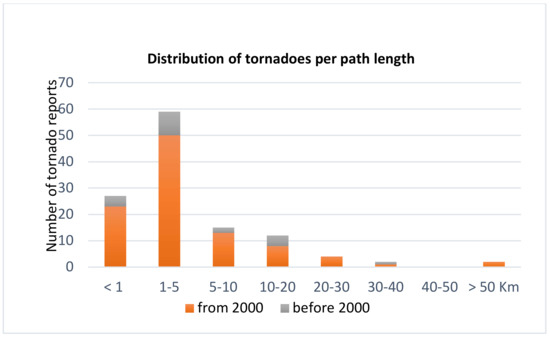 Path length distribution of 121 reported tornadoes (until 1 January 2020).